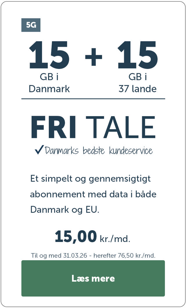 Brug rabatkoden ’medlem’ og få det populære abonnement med fri tale og SMS samt 15 GB data til kun 15 kr./md. til og med 31.3.2026.
