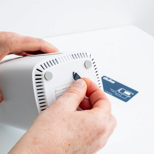 Når du har klikke dit SIM-kort ud, så skal det indsættes i bunden af routeren. Husk at tjekke at du vender SIM-kortet rigtigt.