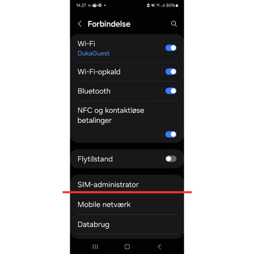 2/8: Find SIM-kort indstillingerne. De kan ligge under punktet 'Forbindelse'