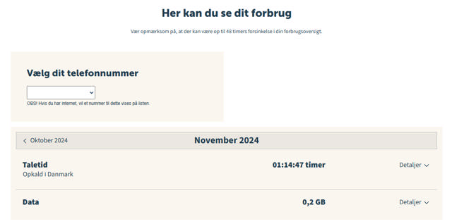 Hernæst kommer du ind på din forbrugsoversigt, hvor du kan se dit forbrug for nuværende måned. Du har også mulighed for at se dit forbrug i de forudgående måneder, ved at klikke dig tilbage i månederne i toppen til venstre. Du kan også se dit forbrug i detaljen, ved at klikke "Detaljer" under punktet, du ønsker at tjekke.