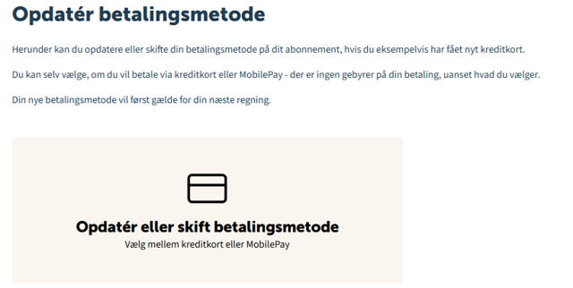 Hvis du har haft problemer med at tilføje eller opdatere dit betalingskort, er du naturligvis velkommen til at kontakte os på telefon 77 34 18 18 - vi sidder klar til at hjælpe dig igennem processen.