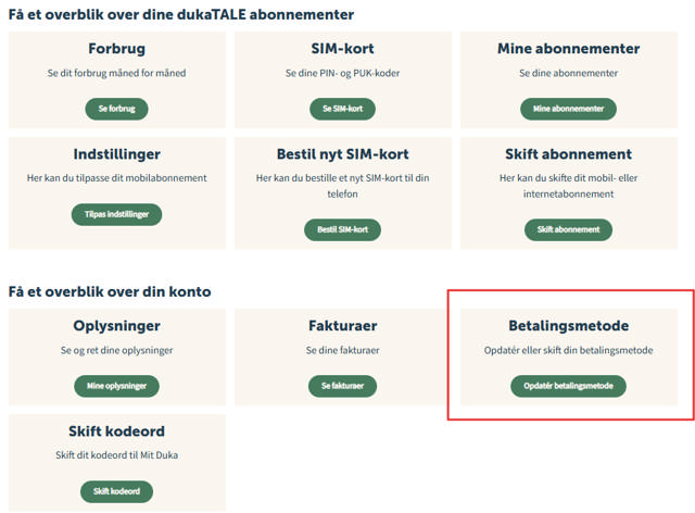 Har du brug for at tilføje eller opdatere dit betalingskort, kan du gøre det på Mit Duka.
